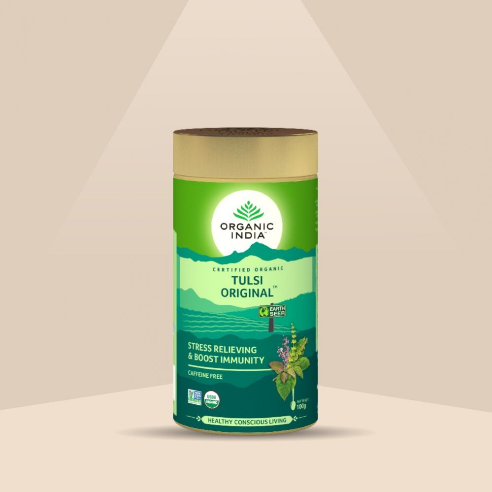 ORGANIC INDIA’s Tulsi Original Tea 100g loose tea - Stress Relieving & Boost Immunity, energizing and delicious herbal tea. Tulsi or Holy Basil is herb which supports the immune system and helps your body relieve the negative effects of stress. Noted for 5,000 years throughout sacred Indian scriptures, Tulsi’s remarkable life-enhancing qualities are now here for you to enjoy. We have selected three particular types of Tulsi for our blends: Krishan, Rama and Vana Tulsi for their complimentary health benefits for for healthy metabolism & weight management. Rich in antioxidants Helps Fight Illness, Cough & Cold.